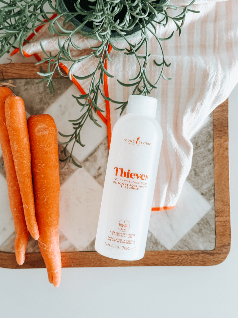 One of our favorite ready-made products for the kitchen is called Thieves Fruit & Veggie Soak. It’s made with DiGize, Purification and Thieves and highly concentrated to last a long time. It comes in a 16 oz. container and you just use 1-2 capfuls per sink full of water. That’s a LOT of produce you can wash.